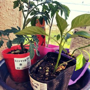 幼farmに、ミニトマトとピーマンを迎えました🍅早速幼児が、お水をあげてご満悦☺️