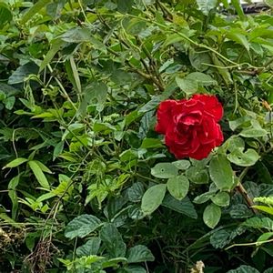 朝散歩。 みどりの中に真紅の薔薇をみつけました。