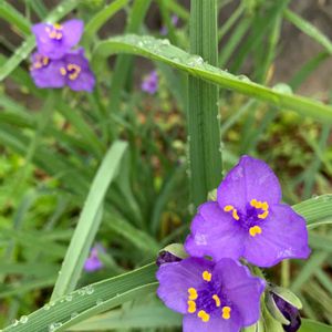朝散歩。ポチポチの雨。 可愛らしい花をみつけました。 鮮やかな紫色。名前は.....。