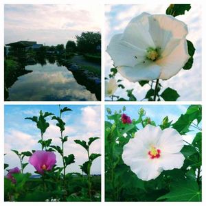 今日の散歩道🚶 まだまだ暑いですね💦 ムクゲが、それぞれ違う顔で良かったです(^O^)/ 朝は、曇ってましたが、水に映る雲を📸 夏バテ防止対策しなきゃですね🙋