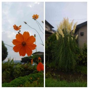 今日の散歩道🚶 天気が悪いですね😰 ここら辺は、ムシムシします💦 秋を感じる🌳パンパスグラス(合ってるかな…😅💦)とコスモス👍 天気が悪くても、元気です👌