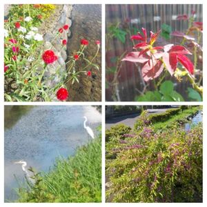 今日の散歩道🚶 台風の被害はどうだったでしょうか? こっちは、ひたすら暑かったです💦 朝焼けが、なんか怖い感じの色でした😅💦 ひまわりがまだまだ元気です🌻 水の中に咲いてる花たちは、名前があるのでしょうか? 紫の整列してる子も名前が解らず😣 ブルーサルビアと、教えて頂きました(^O^)v たくさん咲いてます(^O^)/ カエルさん親子はおまけです(^O^)/