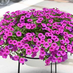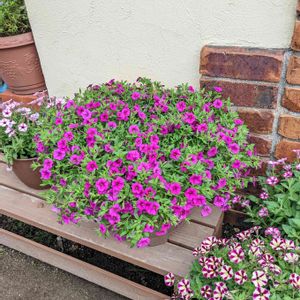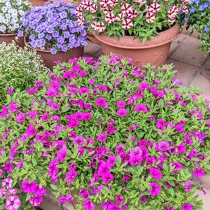 ①ぐんぐん大きくなるカリブラコア やっちゃんねるさんに影響されお迎え🌱 ほんとに横にぐんぐん広がります‼︎ ②あふれ咲きペチュニア ブルーベリージャム 名前の通りこんもりあふれ咲いてくれます😊✨ ③ミリオンベルバターポップコーン 色がポップコーンのよう💖弾ける感じが可愛い❣️🍿 ④ミリオンベルプチホイップストロベリー 成長がゆっくりめでしたが、こんもり 大きくなってきました🥰 撮影後、梅雨前に切り戻しました✂️💕