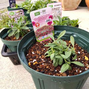 PW×コメリ苗 ぐんぐん大きくなるカリブラコア 6号鉢に植えました 仮植えしてある程度育ててから本拠地に植え付けます 培養土(25Lで498円程度) マグァンプK オルトラン 超基本です😐