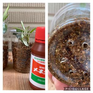 7/21に剪定したオリーブからの挿木、根っこ出てた❣️剪定した方からも新芽が出てたので期待して見た所。うれしいなぁ。 メネデールすごーい! 植え替えはもうしばらくしてからの方がいいのかな??