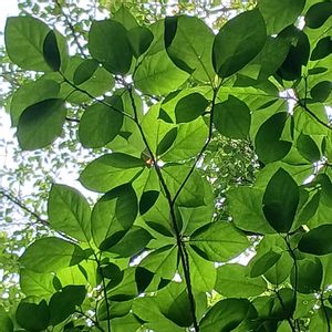 いつも下ばかり見て歩いてますが 見上げれば 重なりあった葉のシルエットが とても綺麗でした なんの木でしょうか? 5月23日撮影