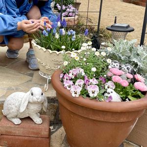 ムスカリmix(コストコ購入の球根) 春の寄せ植え(花かんざし、ビオラ、チロリアンデージー、シロタエギク) 毎年暑くなるのが早いから、なるべく鉢植えを増やさないように戒めています。。。