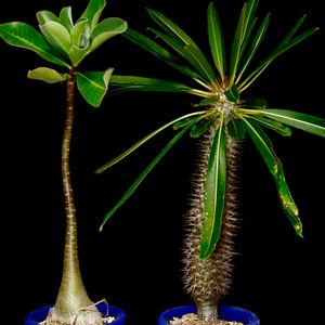 左 アデニウム 2017年5月種子から、現在の丈42cm 塊根部の直径5、5cm 右 パキポディウム丈35cm幹直径5cm 市販の入手時の丈4cm