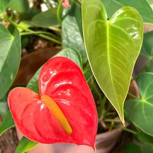 今日のお花アンスリウム💚❤️ 去年の株分けと植え替え後に初めて出てきた、お花に見える仏炎苞がだいぶ伸びて来ました🎶