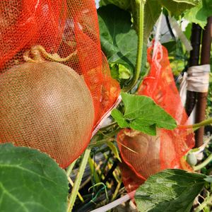 今日のお花 *メロン* 今年もネットメロン🍈クラリスを植えました。 昨日赤いネットに包み吊りました。 2️⃣枚目 メロン🍈とカボチャ🎃 3️⃣枚目 マクワウリは黄色く色づき収穫間近です。 メロンはネット模様が楽しみ🍈🍈🍈