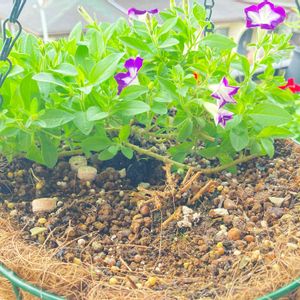 初めてのペチュニア・カリブラコア! いったん100均の6号に植えてちょい盛りくらいにしてから植え替えの予定〜 さし穂の数が取れたらでっかい鉢と組み合わせて2段とか3段の豪華咲きを目指したい!
