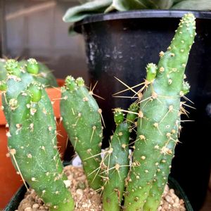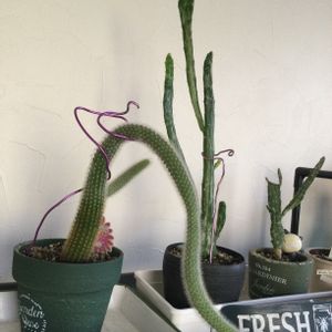 3年前にダイソー購入したサボテン🌵さん、ヒモサボテンだったのね😘。胴切りしたウチワサボテン(真ん中)は、上部の方が育ちました🥸🧐。