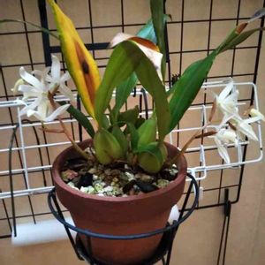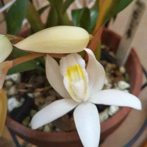昨年購入した、蘭科「セロジネ」咲いてます。朝から天気よく囲いの中の大文字草等の枯れ葉処理してました。トイレと水分補給に戻り、一人飯の準備しようと思ったのに🌸GSアップ💐たしか朝八時温度測る時は、まだの様子👴寂しいじゃありませんか🤗まだ一輪、花芽がは二本あります。