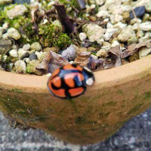 昨日は、囲いから鉢だししてましたら、てんとう虫の大きなやつ1㎝を無理やり起床、移動させてしまいました。動くのに数分 寝起きが悪い👴俺そっくり動作です。 ちゃう違う👨いや〰️😃機敏に動きポトリと石の中に寝床変更しました。