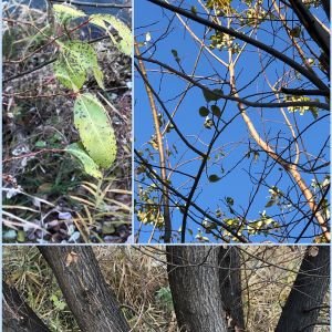 鳥が落とした種がたまたま植木鉢に落ちそのまま放置していたら木になりました。未だに花も咲かず実もならないので何の木かわかりません。葉っぱは縁がギザギザしていて薄く柔らかいです。黄色く紅葉してます。教えて下さい。