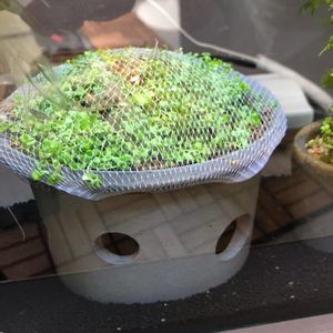 青メダカの水槽にも 夫が作った隠れ家 水草はネットをくぐり抜け ニョキニョキこんもりなる予定らしい