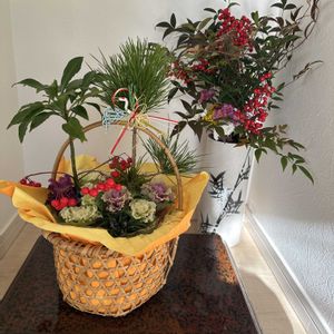 皆様、楽しい1年をありがとうございました🙇♀️ 寄せ植え用の🧺に、先日の黒松や万両、そして早めに購入して有った葉牡丹2ポットと庭から掘り出した玉竜で、お正月に向けた寄せ植えを作りました♪ 玉竜は今頃、綺麗な濃いブルーになっているのに、今年は色が付いてません! 黒松と万両の高さ調節をして植えましたが、万両が大き過ぎました! 実の位置がもう少し上ならと、色々と欲が出ますね! 華やかに出来たので良しとしました。 切り花がお高いので、2ヶ月ほど床の間に飾ります。 万両と黒松 ¥850 葉牡丹 ¥600 ¥1,450で満足の出来る寄せ植えになりました♪ 切り取った万両と黒松の葉が、勿体無くて庭のローズマリーと実付きの悪い南天で、15㎝のミニリース簡単に束ねてのくくりつけです。 部屋に飾っています。