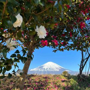 今朝の富士山🗻は,山茶花の花🌸の中からです‼️ 紅白の花の間から撮れました‼️ (2021.12.15. 9:55 御殿場市秘密の場所より)