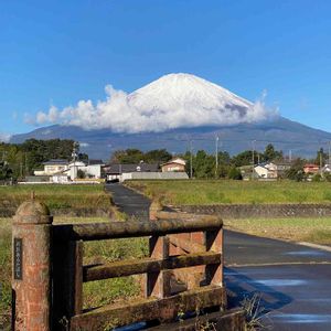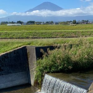 今日はお昼頃から富士山が見えました‼️ 🎶頭を雲の上に出し、 四方の山を見下ろして、、、♬ 富士山の湧き水が流れる小川とコラボ (2021.10.11 12:30 小山町大胡田より)