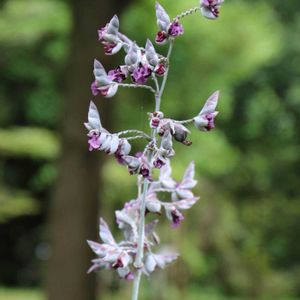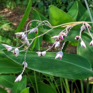 ミズカンナ クズウコン科ミズカンナ属 多年草 北アメリカ、熱帯アフリカ原産 水深の浅い池沼の水辺に育つ。 別名はウォーターカンナ、ヌマバショウ 日本には昭和初期に渡来し、観賞用として導入されたものが各地に野生化している。 草丈1〜3mで、夏には人の背丈を超えるほどになる。 カンナのような長さ20〜60cmの大きな葉を持つ。 巻貝みたいな蕾から赤紫色の花が咲く。 茎先に長い花柄を出し、10〜30輪の小花をまばらな穂状に咲かせる。 小花は1〜2cmで、形状ははっきりしないが、紫色をした花弁のようなものは「仮雄しべ」で、粉白色を帯びた萼とのコントラストが見どころである。 花後にできる果実は直径1cmほどの球形で、中には黒褐色の種子が入っている。 花期7〜10月 花言葉は「堅実な未来」 よく見ると、すでに果実ができ始めています。