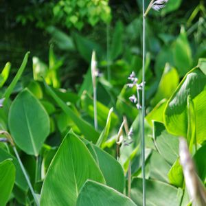 ★ 水生植物 ミズカンナ 水カンナ 英名 ウォーターカンナ Water Canna クズウコン科ミズカンナ属の多年草 北アメリカ、熱帯アフリカ原産 日本には昭和初期に渡来 葉っぱが カンナに似て、水のあるところに生えることからこのお名前が付けられました。 1つ目 草丈は1〜3mにもなる大型の草 お名前の由来にもなってる 葉っぱは 長さ17~55㎝、幅7~22㎝の卵形で 硬い紙質 シューーっと高く伸びた茎先に お花を付けます。 2つ目 7~18㎝の集散花序。 粉白色を帯びた萼に包まれるように 青紫色の花が10~30個ほど咲きます。 この写真は、咲き始めの頃のようです。うむぅー お花の造りがよくわかんないですね。ゴメンナサイ 花期は、7〜10月 3つ目 お花は終わって実がなってるのかな?って思ってました。 よーく見ると ん?!おやおや! お花が咲いてて、若い果実も混ざってますね 4つ目 お花の後にできる果実は 1cmくらいの球形の蒴果。 紫色から完熟し褐色になる頃果皮が裂け開くと 中には黒褐色の種子が入ってます。 撮影 2023 6/7 〜 11/4 小石川植物園