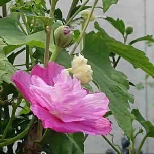 ピンクデライト 本来の花色はほんのり濃いピンクが差し色に入るようです 薔薇に例えるとマダムピエールオジェのようかしら フヨウやハイビスカス、ムクゲのお花が大好きです GSを知ってから いても立ってもいられず ついにお迎えしました(*´꒳`*) 一緒に紫玉さんも╰(*´︶`*)╯♡ 小さな小さな苗木です 紫玉さんはまだ蕾だけなのでお披露目できないのが残念です 小さな庭なのでしばらくは鉢管理です 地植えにする時に植える場所に困るのですが 昔読んだ【ぼのぼの】のアライグマさんの 「後で困るのだったら 後で困ればいい」と言うセリフが 琴線に触れ何時も心の片隅にあるのです 結構 なるようになるものですヽ(*´∀`)