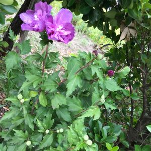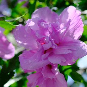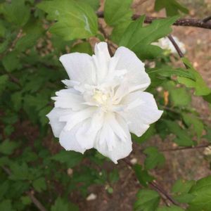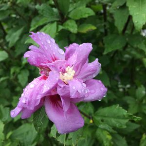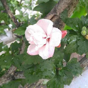 八重ムクゲ 雨のなか 庭を探索していたら ムクゲの1輪目が咲いていました