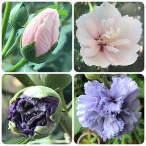 八重のムクゲ 上 ピンクデライト 下 紫玉 紫玉はずっと蕾が膨らむと黄色くなり落ちていたので 初めての花です 同じ八重でも花びらの枚数が多いので 開くのが大変なのかも知れません まるで薔薇のルージュピエールドゥロンサール 名前も花の開き方も薔薇のようです