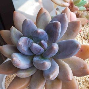 セデベリア属 紫麗殿🌱 晴れた日には綺麗に撮れない子なんで、天気の悪い日🌂☁の今日の一枚✌ パキベリアとして売られてることも多いんですけど、セダムとエケベリアの交配種で「セデベリア」です☝️お父さん(アフィニス)譲りのぶっとい立派な茎がチャームポイント🤭💕 この子は一昨々年の11月にアソートをお迎えした中に入っていた子で「見返り美人」という名札だったので「月花美人」というタグでずっと育ててました💦 この子の色がめちゃくちゃ気に入ったので、別の時期に「月花美人」という名札の見切りの子を迎えて育てるもなんか違う😅 ということで、今年の3月から「紫麗殿」というタグに変更しました😆👍 「たっちんの紫麗殿」タグをタップでこの子の生長記録のみどりのまとめが簡単に見れます😊🎵