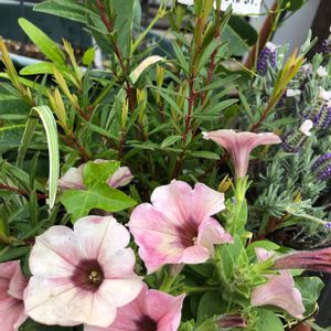 寄植えペチュニアのアイボリーピンク💗 アイボリーから中心のむらさきに移るまでのアンティークなピンクが気に入ってます💗💛💜