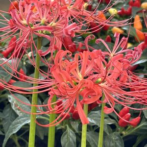 ヒガンバナ 今朝の自宅近くのHCに咲くヒガン バナです。彼岸が近くなると咲き 始めますね〜。ヒガンバナは真っす ぐに伸びた茎に細長い花びらは反り 返ってカールしています。葉は開花 時につかず花が散った後に出て来る のも面白いですね〜。(*´-`)❣️