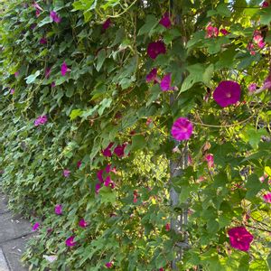 地面を張って咲いたアサガオ。 縁の下の出入り口に手を掛け、花で塞いで😆