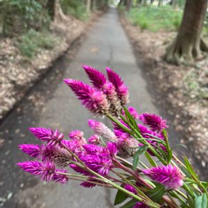 朝、訳あってお花片手に、息子とサイクリング🚴 1枚め)お気に入りの小径。通称ブロッコリー森(我が家ではカブトムシ森のどんぐり小径) 2枚め)よく通りかかる畑のケイトウ。 花言葉『個性』『風変わり』そのままに🤭 野菜を販売されている時間に、ご近所さんを見かけて、 「これ、ケイトウですよね? 毎年きれいで、何て名前か気になって」 って話していると、 「ねぇ、この花は何て名前?」 と、別のお客さんが聞いてくださり、 「わかんないけど持ってきなよ✂️」 と畑主さんが、長持ちしそうな咲き始めを選んで切ってくださいました。 ニョロニョロ白いのは、花が終わって種ができそうなもの。 「ママ😅自転車なのに、どうすんの💦」 と、息子につっこまれながら😊 家の前で会った、お花好きの男の子(2歳)にもお裾分け。 カサカサ千日紅みたいな感触。