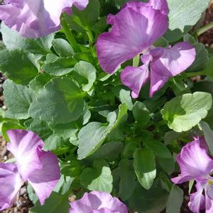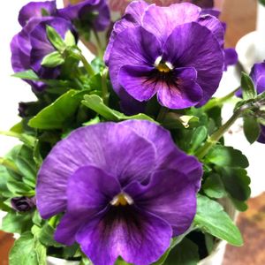 おしゃれビオラJoyと葉牡丹フレアホワイト お花屋さんでカワイイ💓と思いお迎えしました。 家の庭にあった何種類かのリーフ、お花を寄せました。 チョッと寒そうな寄せ植えになってしまいました💜