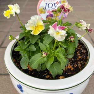 もう1つの寄せ植え 背景にネメシア レモンパイ ピンクとイエローのお花が可愛い 白いチロリアンデージー おしゃれビオラJOY ローダンセマム アプリコットジャム 4株で丁度鉢に収まる位 隙間が殆ど無かったので土を入れるのを慎重にました👍 隙間が無いように土をツンツン菜箸で入れ込み終了👌 2つ共お水を上げて軒下へ入れて上げました 軒下ロードお花で可愛くなりましたよ॰˳ཻ̊♡