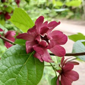 黒花蝋梅(クロバナローバイ) 黄花の蝋梅とはだいぶ違いますね⁉️ 開花時期など2月と5月です 🌱🍀属が違いますね🤟🤟 ロウバイ属・クロバナローバイ属ですか? 💐北アメリカ東部の原産?
