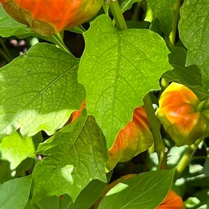 仕事の帰り道 畑の花いじりをしていたおじさんと何回かご挨拶するようになり、去年、頂いた花が我が家の花壇のあちこちに増え花を咲かせています✨ 増えてます〜💦 ホオズキの種類もいろいろあるようで、このホオズキの葉には黒い点々があります。 クロホオズキらしいです🤭