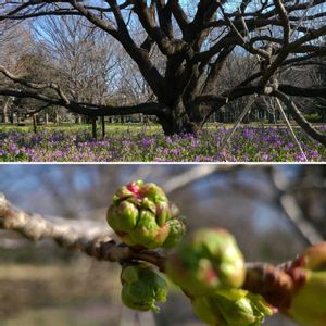 小金井公園🌳の衣通姫(ソトオリヒメ)や枝垂れ桜はもう蕾に赤い色が😁 株元のムラサキハナナはスタンバイ🆗です🌼🌱しっかり株元を守ってますね☺️