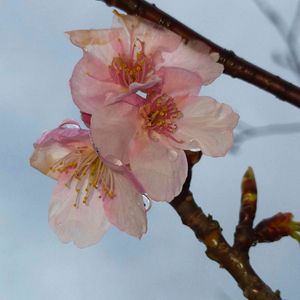河津桜 開花しました! 緑ヶ丘公園さくらの丘 雨上がりでしずくがついています。
