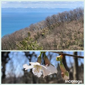 角田山 五ヶ峠コース オクチョウジザクラが咲いています🌸 日本海と佐渡島 雪を被った金北山