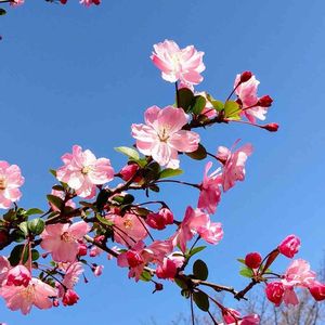🌺花海棠🌺(バラ科)ようやく開花しました💕 花言葉 艷麗 美人の眠り(皇帝が眠る楊貴妃を🌺カイドウの花に例えた故事によるとか) 今年は剪定間違ったのか、花芽の付かない枝もあり淋しい チョット残念だけど〜 風に揺れる🍒サクランボのような蕾といい〜透き通るピンクの花が めちゃ愛らしい💓