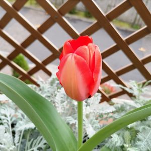 ムフフフフ〜❤️ チューリップが咲いてきました〜❤️ 背の高いチューリップだよ〜 レッドインプレッションっていう品種名です❤️ このチューリップの球根は1つだけ購入しました、笑❣️ 他のチューリップはまだ咲いてないので、共演できるかな〜長く咲いてくれますように🙏