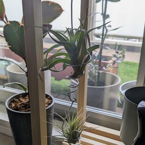 テレビ横のチランジア。 突っ張り棒に針金でフックを作り、掛けています。 下のハリシーは、迎えた直後に蒸れで枯らしそうになってしまいましたが、復活して立派になってきました。