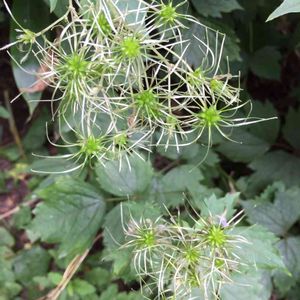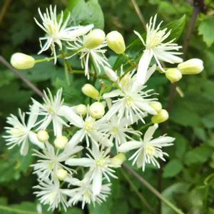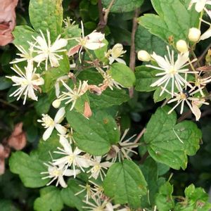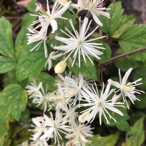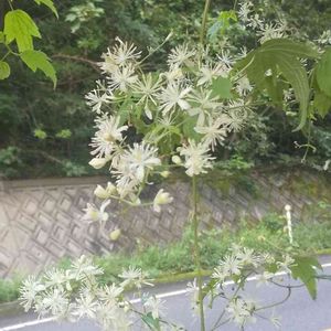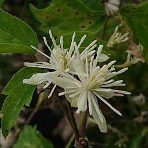 ボタンヅル キンポウゲ科センニンソウ属 本州〜九州 落葉つる性半低木(半草半木) 花弁は無く白い[がく]が有る 花糸は長いのて花冠から飛び出し目立つ。 葉は鋸歯のある3出複葉 対生 牡丹の葉に似ていることから。 樹冠を覆う、そう果は冬中に霜の降りた朝などは美しい。 毒草です。