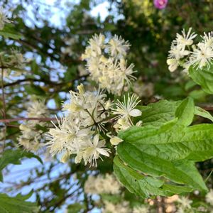 出掛け先で、見かけました😊 つる状で、他の木に絡まって咲いていました。 白く輝いていました✨ 調べてたぶんボタンズルかな…?
