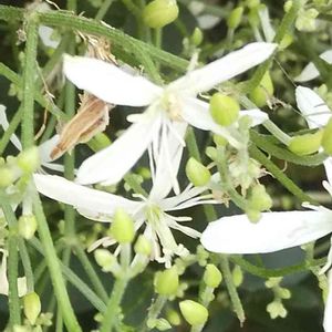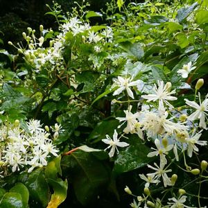 里帰り中に出会った花です 田園風景の中 木に絡みつくボタンヅルが 花盛りで 里山の風景を彩ります 日本産のクレマチスの お仲間です 葉に切れ込みがあり その葉がボタンの葉に 似ていることから その名前がついたと 言われています 花が見事だからと言って むやみに 手折らないでくださいね 毒性植物で 樹液で皮膚かぶれを 起こすこともあります