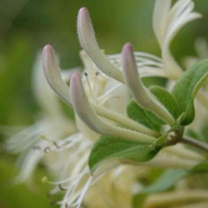 忍冬(スイカズラ) 咲き始めました。 ペアで仲良く咲く姿、好きです。 そして蕾はほんのりピンク色に薄化粧して。