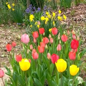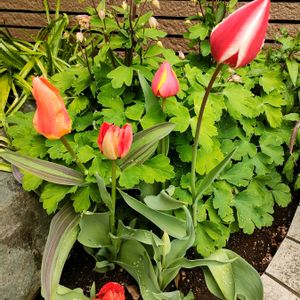 庭で次々咲いているチューリップたち🌷 ①『ミランダ』 赤のクールな八重咲きチューリップ 思った以上にステキです💖 ②『マウントタコマ』 ちょっと乱れて咲いてしまいました💦 ③『ワシントン』 黄色に絵の具で描いたような赤がオシャレ✨ ④名称なしのオーソドックスなチューリップも可愛いです💕 ⑤『アリソンブラッドリー』 濃い赤紫の大人カッコ良いチューリップで、とても楽しみにしていたのですが、思ったより背が低く下で咲いてしまい、魅力を存分にあじわえませんでした😣 鉢植えにすれば良かったです💧 隣に咲いているのは去年の掘り上げ忘れのチューリップ🟣 チューリップの開花もそろそろ後半戦に突入です😊