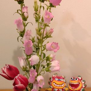 可愛いピンク色でしょ😊と 母へ… 和名〝釣鐘草〟=寺院 と連想するから嫌らしくて😢 アンタが気に入ったんだから持って行っていいよと😨 (確かに最初にいいなぁ〜欲しい❧と思った後に あまりにも可愛らしいので母へのぷちプレゼントにしようって思い直したよ) 花言葉「感謝」ピンク色「不変」 は通用せず😮 ありがたく飾らせていただきました。 お気に入りの玄関飾りと共に😌