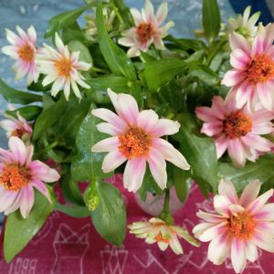 ジニアシンデレラだったかな? ジニアはいつも上手く育てられなくてこれも下葉が枯れてしまってますが〜 お花は一株から色んな姿のお花を見せてくれています💕